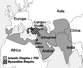 This quarreling does not seem to have hindered the spread of Islam at all. By 750, Islam had spread much farther than some of early partisans probably believed could even be possible. To the north, the Byzantine Empire in the Mideast was squeezed closer to its capital in Constantinople. To the west, all former Byzantine possessions in northern Africa were conquered, and in eastern Africa, Islam even jumped over to Europe and took control of much of Spain. To the east, Islam spread far into what is India today, challenging the Hindu culture, and setting the stage for the wars between Pakistan and India today.