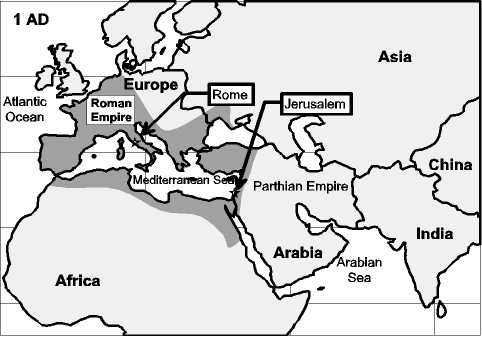 As shown in this map, the Roman Empire was quite extended. To the east, the Romans conquered Greece and Macedonia, and from there went on to conquer much of Alexander's old empire. However, the Romans went west as well, conquering much of northern Africa, all of Western Europe, even extending into the British Isles.